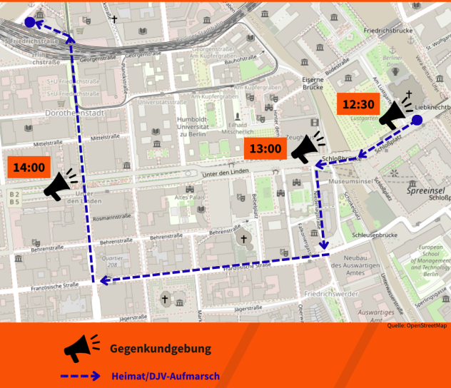 - Ab 13 Uhr: Kundgebung am Zeughaus (DHM, Unter den Linden 2), im Bereich Unter den Linden Ecke Niederlagstraße