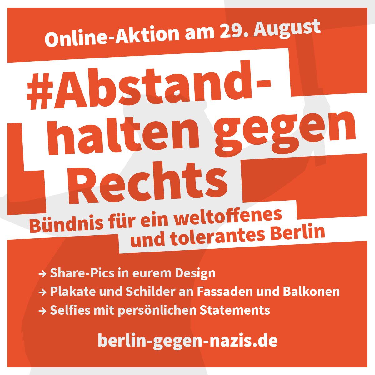 Das Bündnis für ein weltoffenes und tolerantes Berlin hatte im Vorfeld des 29. August zu einer Online-Aktion unter den Mottos: „Abstand halten gegen Rechts“ und „Hass schadet der Seele“ aufgerufen, um die Berliner_innen zur ortsunabhängigen Positionierung zu animieren. Berlin gegen Nazis dokumentierte im Rahmen dieser Aktion am 29. August auf Twitter und Facebook alle Positionierung und Proteste des Frühjahrs in Berlin für die bundesweite Öffentlichkeit.