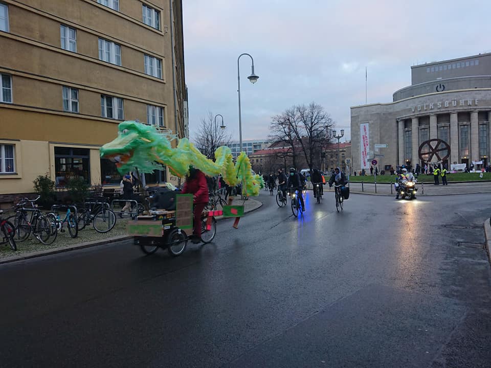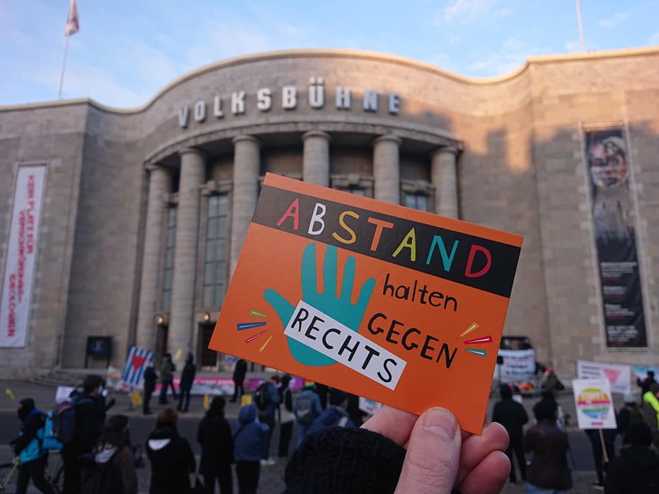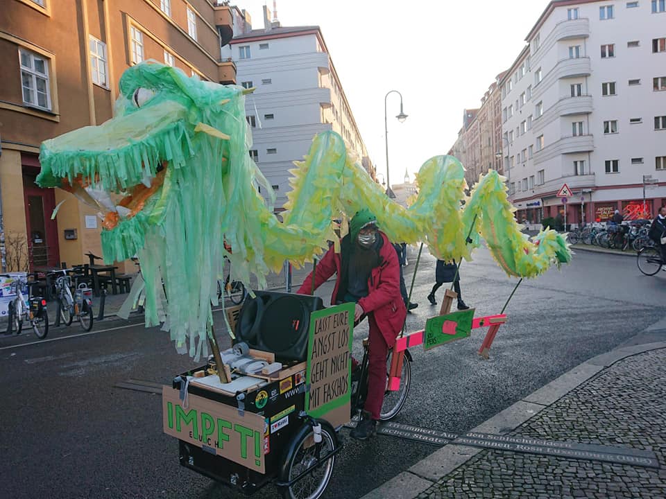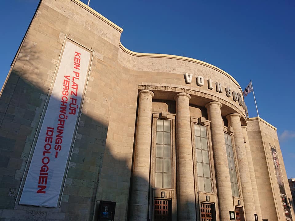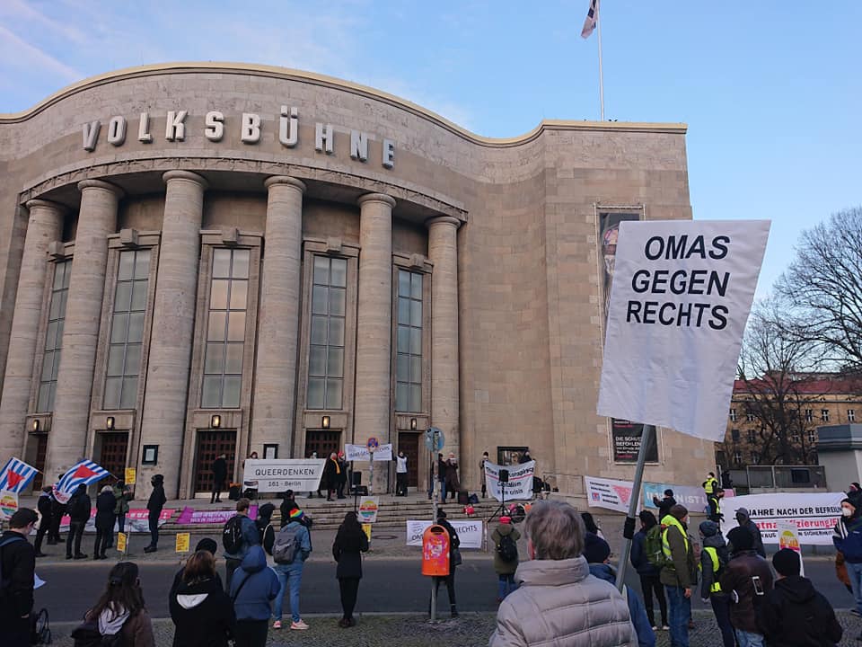 Zum Abschluss des Jahres gab es am 30. Dezember eine weitere symbolische Kundgebung auf dem Rosa-Luxemburg-Platz zur Positionierung gegen Verschwörungsideologien, Antisemitismus, Rassismus und gegen Rechtsextremismus, da erneut große verschwörungsideologische Versammlungen angekündigt waren. 70 Teilnehmer_innen haben die Berliner Initiativen und Bündnisse mit Abstand & MNS vertreten. Ein wichtiges verantwortungsvolles Zeichen für Solidarität in der Pandemie. Zugleich positionierten sich die Volksbühne Berlin mit einem Fassadenbanner erneut gegen Verschwörungsideologien. Auf der Kundgebung gab es u.a. Redebeiträge von den Berliner Omas gegen Rechts Berlin, vom Berliner VVN-B.d.A , Berliner Bündnis gegen Rechts , Aufstehen gegen Rassismus Berlin, dem Antirassistischen Aktionsbündnis Berlin und der Initiative für bessere Arbeitsbedingungen im Gesundheitswesen #walkforcare. Ein reptiloider Fahrradkorso gegen Verschwörungsideologien startete zudem vom Rosa-Luxemburg-Platz ins Regierungsviertel
