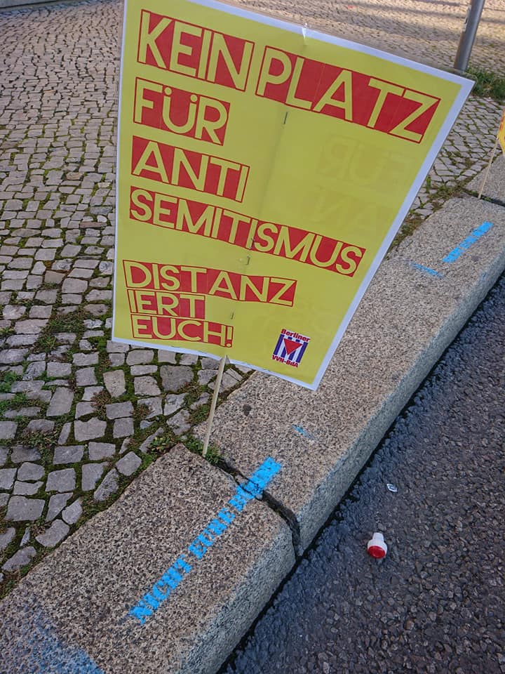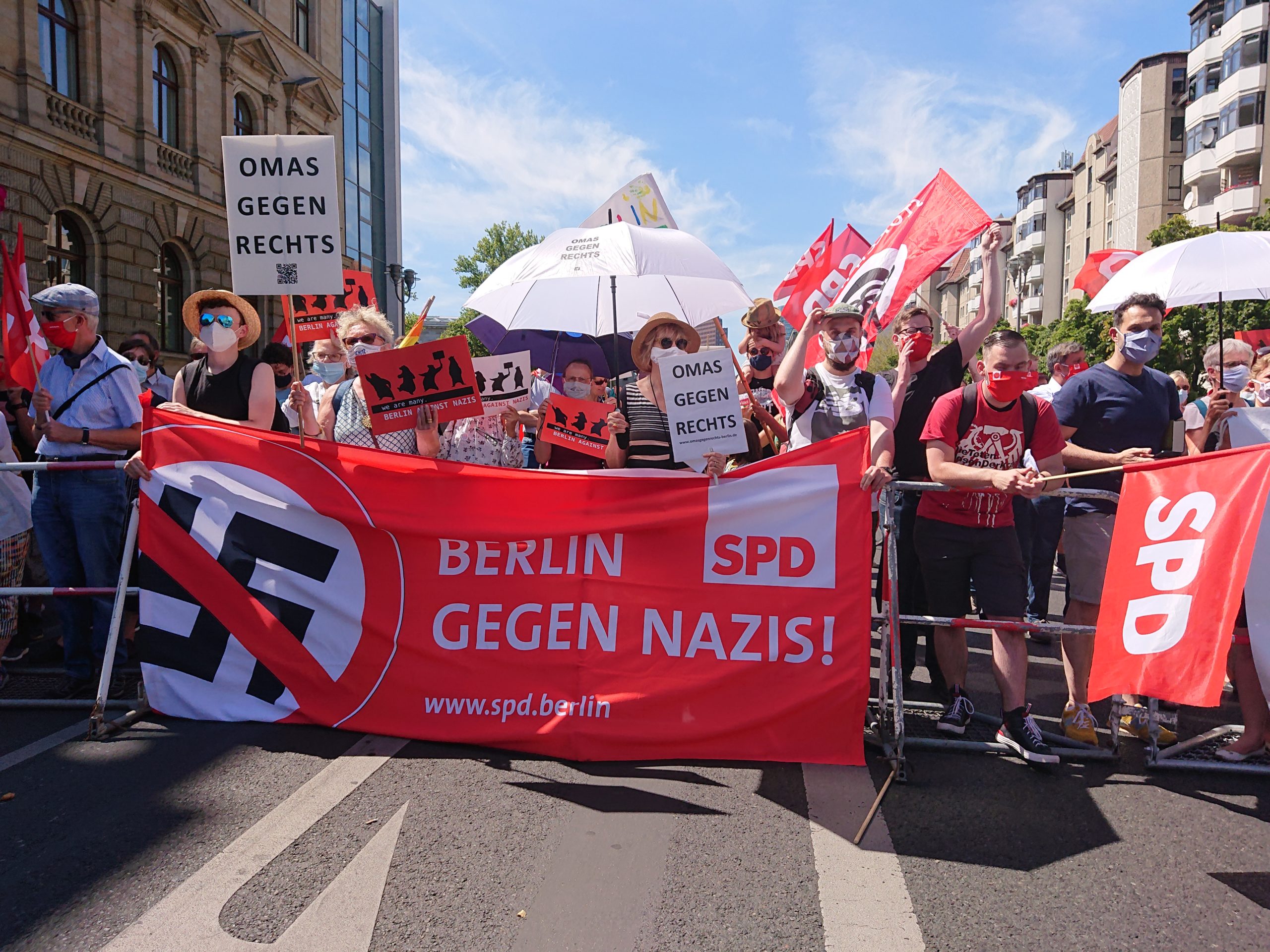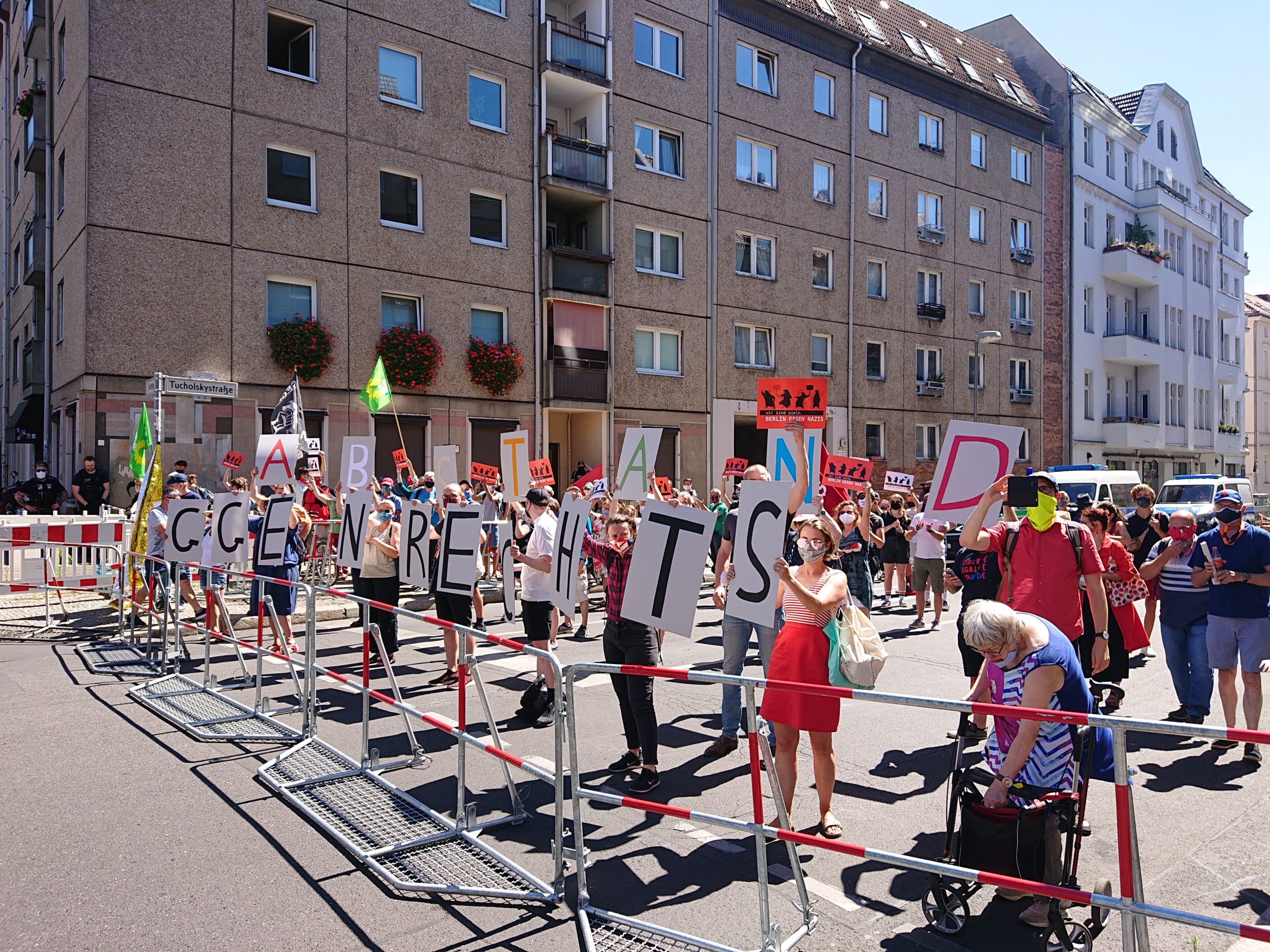 Die Anwohner*inneninitiative für Zivilcourage – Gegen Rechts verteilte im Vorfeld erneut einen Informationsflyer für die Nachbarschaft in ihrem Kiez. Unter dem Motto „Abstand halten Gegen Rechts“ kam es am 01. August zu einer Buchstabenchoreographie auf einer Nachbarschaftskundgebung. Das Bündnis Aufstehen gegen Rassismus und die Berliner VVN-BdA schützten mit einer Kundgebung das Denkmal für die Nationalsozialismus ermordeten Sinti und Roma Europas. Am Pariser Platz führte das Berliner Bündnis gegen Rechts eine Protestkundgebung durch. Die Berliner Omas gegen Rechts planten ebenfalls eine „Schutzkundgebung“ am Denkmal für die ermordeten Juden Europas. Durch öffentlichen Druck aus der Zivilgesellschaft auf die Politik, gespeist aus der Empörung, dass ein großer verschwörungsideologischer Aufmarsch mit teilweise antisemitischem Ausdruck direkt am Holocaustmahnmal vorbeiführen sollte, kam es zu einer kurzfristigen Routenänderung. Die Omas gegen Rechts protestierten sodann abweichend mit einigen hundert Berliner_innen auf der Leipziger Straße.