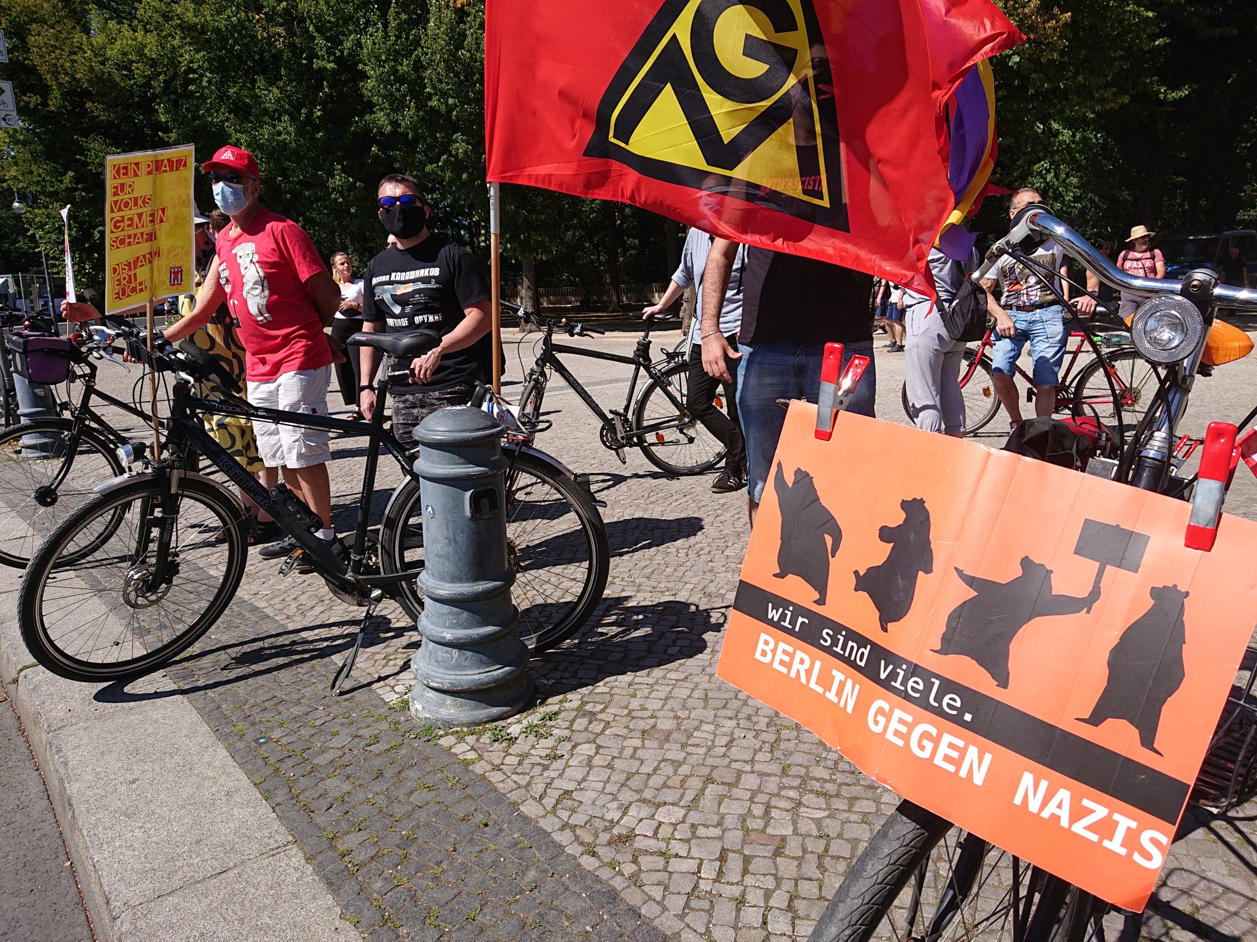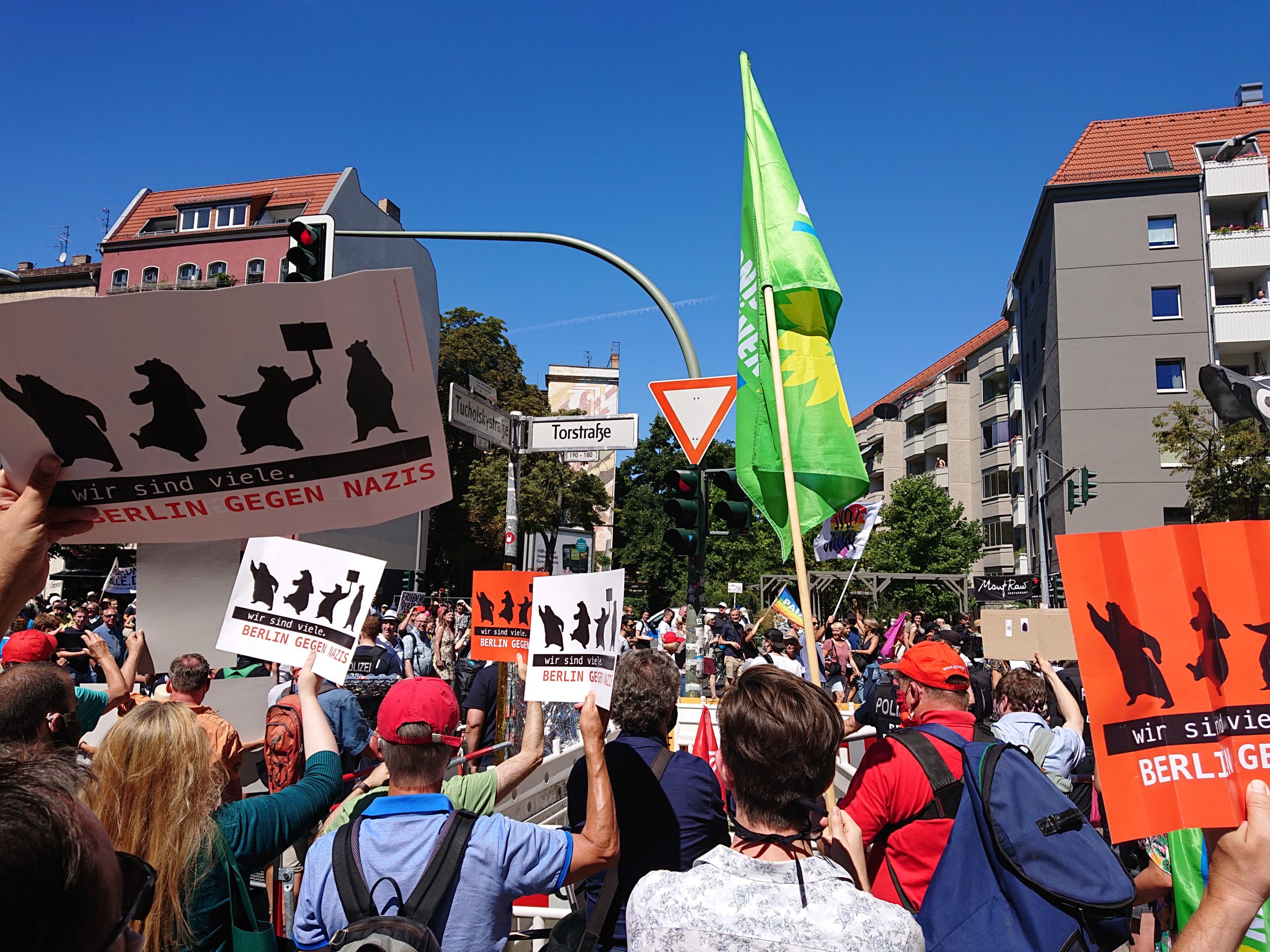 Die Zahl der Teilnehmer_innen an der verschwörungsideologische Demonstration durch Mitte und der folgenden Kundgebung im Tiergarten am 01. August war um ein vielfaches höher, als die der Gegenproteste. Die Teilnehmer_innen an den verantwortungsvollen, eher symbolischen Protesten der Berliner Zivilgesellschaft sahen sich einer aggressiven Menge von mehreren 10.000 Personen gegenüber, die euphorisch die Verweigerung von Abständen und MNS feierten. Der Gegenprotest wurde beschimpft und teilweise auch direkt bedrängt.