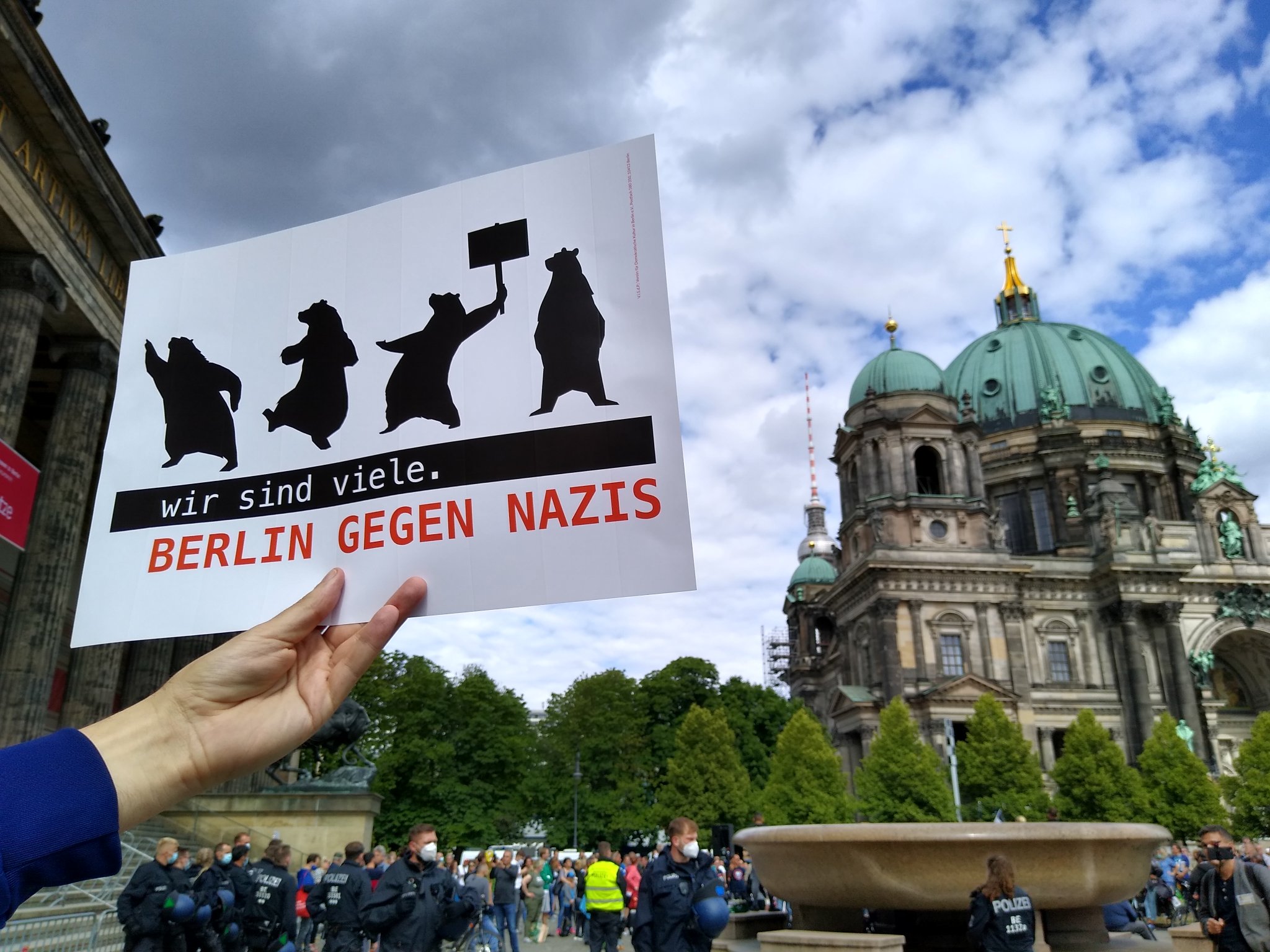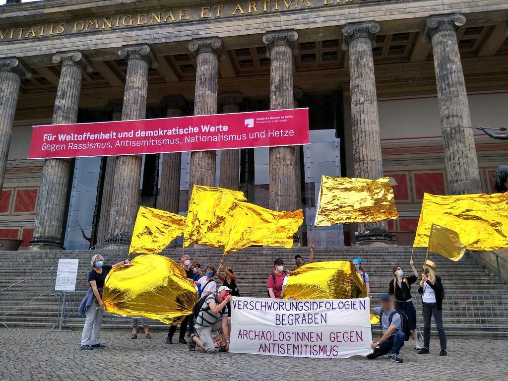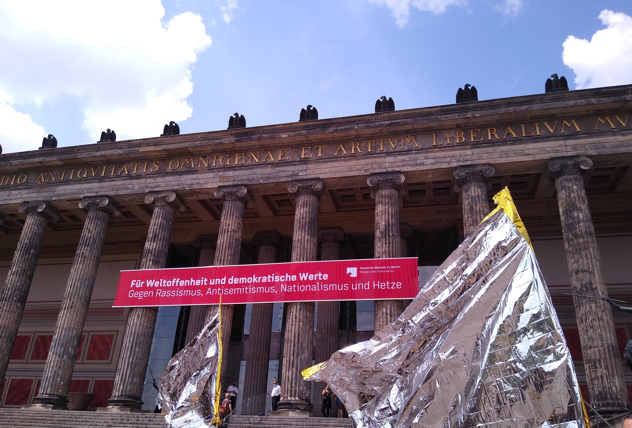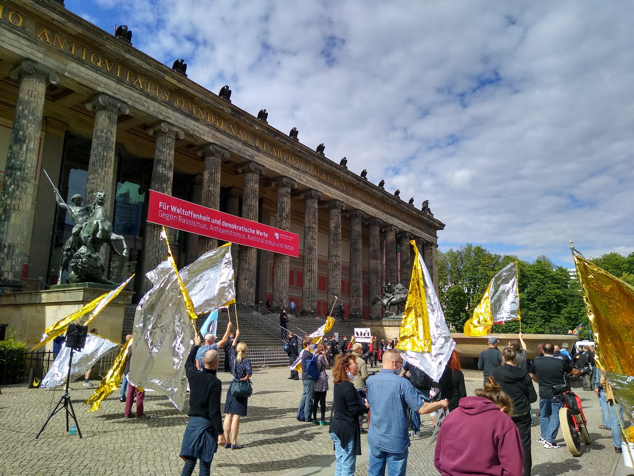 Aus diesem Grund entschlossen sich die Staatlichen Museen zu Berlin – Preussischer Kulturbesitz Ende Juni ein Riesenbanner mit der Aufschrift „Für Weltoffenheit und demokratische Werte – Gegen Rassismus, Antisemitismus, Nationalismus und Hetze“ dauerhaft am Alten Museum zu hängen. Zugleich protestierte eine kleine Gruppe von Engagierten an mehreren Juni- und Juliwochenenden mit Unterstützung von Die Vielen vor dem Alten Museum gegen die verschwörungsideologischen Versammlungen. Kurz drauf wurden diese von der Versammungsbehörde verboten. Das Banner hing bis Anfang Dezember am Alten Museum.