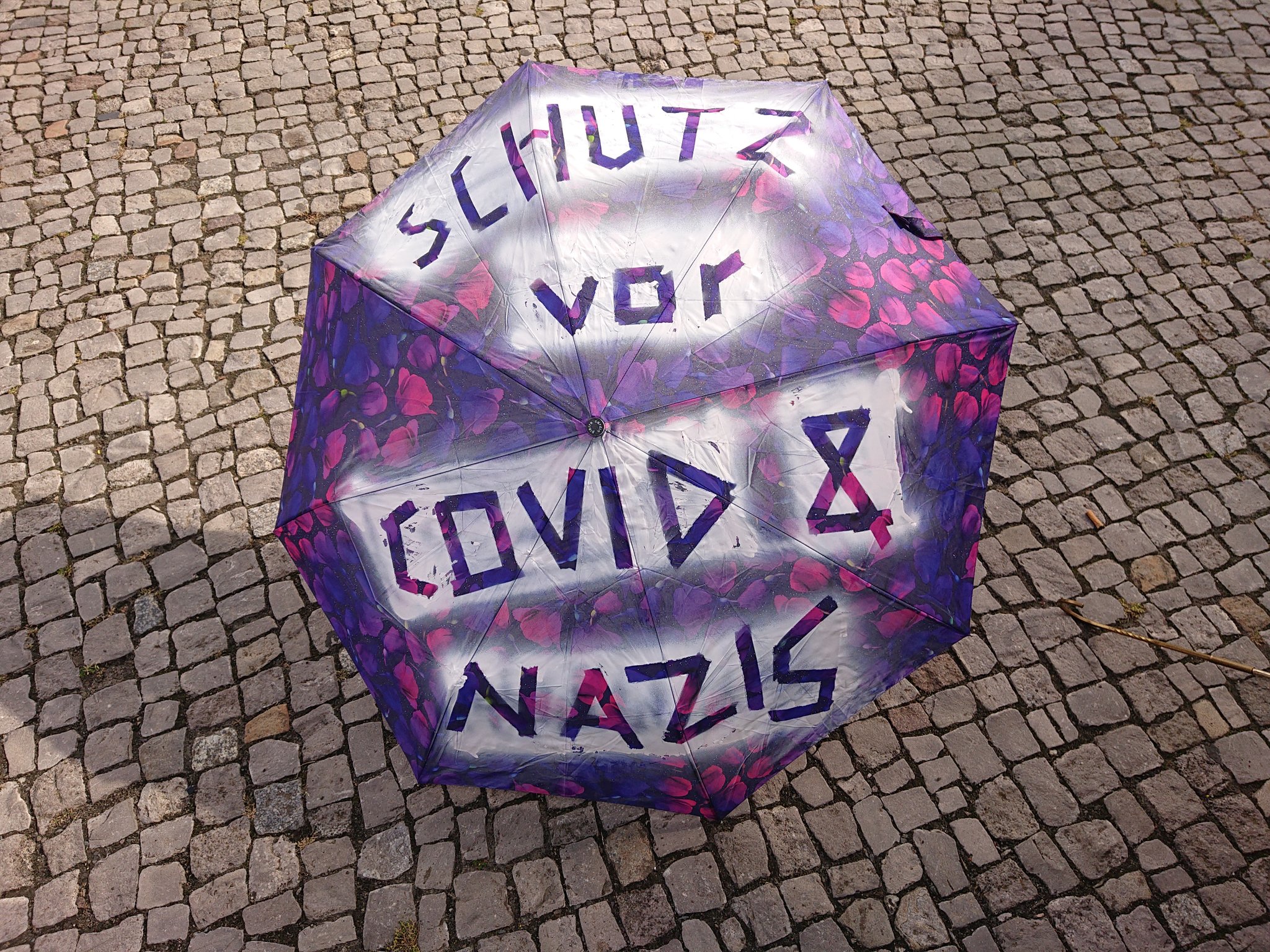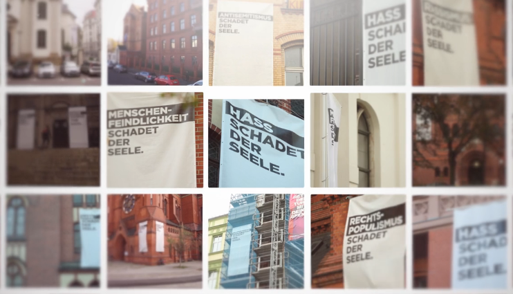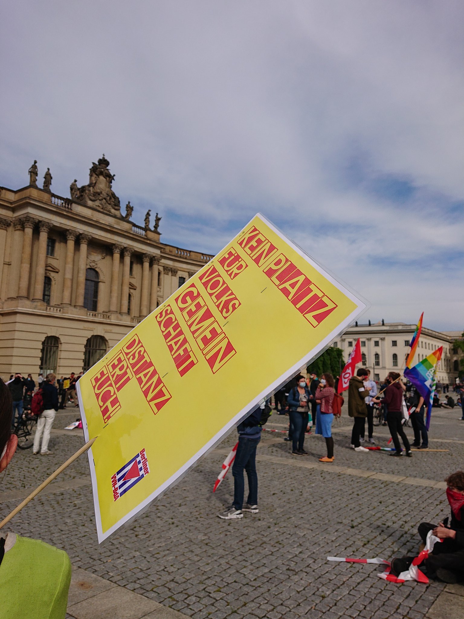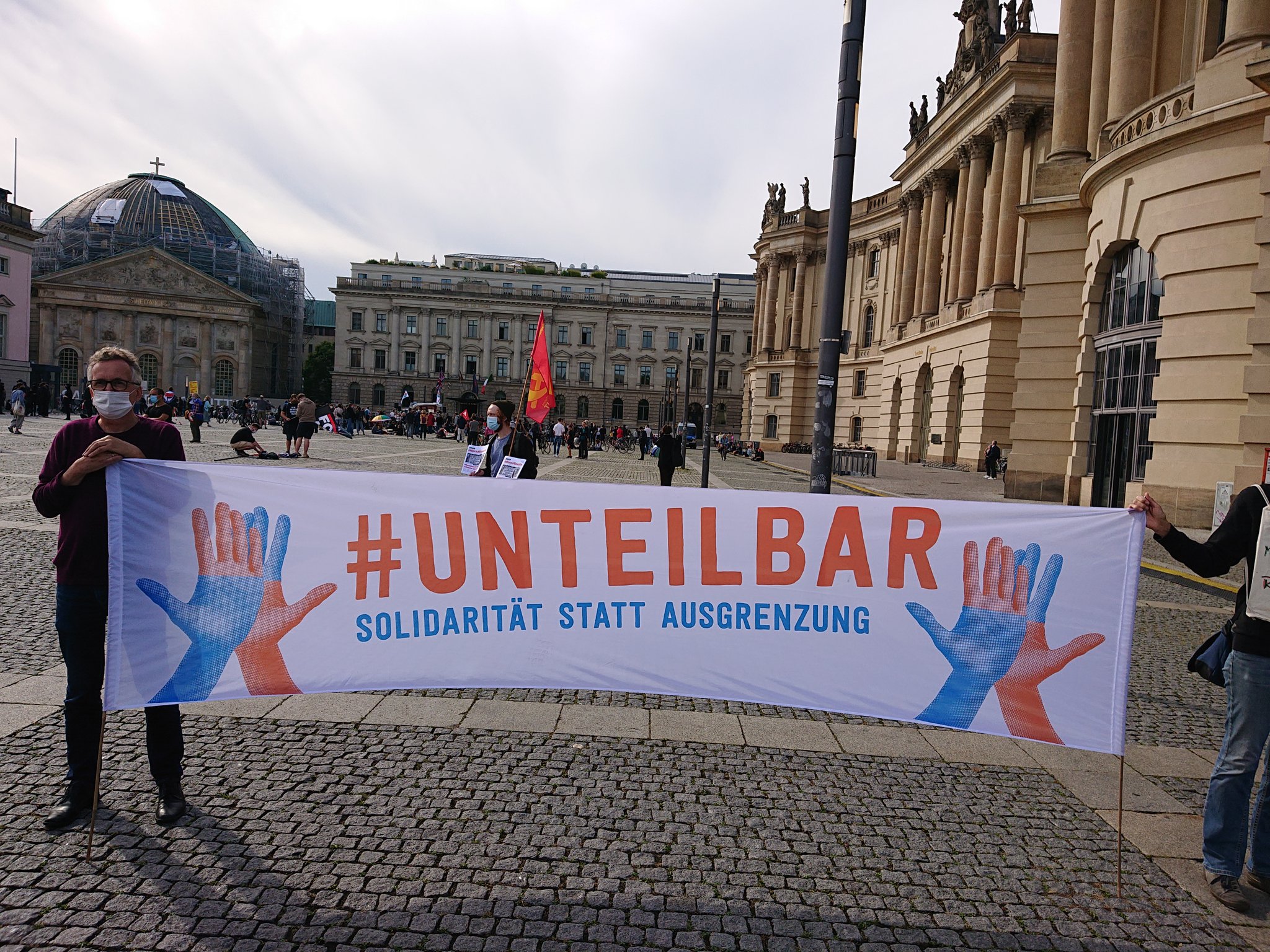 Aus diesem Grund entschlossen sich die Staatlichen Museen zu Berlin – Preussischer Kulturbesitz Ende Juni ein Riesenbanner mit der Aufschrift „Für Weltoffenheit und demokratische Werte – Gegen Rassismus, Antisemitismus, Nationalismus und Hetze“ dauerhaft am Alten Museum zu hängen. Zugleich protestierte eine kleine Gruppe von Engagierten an mehreren Juni- und Juliwochenenden mit Unterstützung von Die Vielen vor dem Alten Museum gegen die verschwörungsideologischen Versammlungen. Kurz drauf wurden diese von der Versammungsbehörde verboten. Das Banner hing bis Anfang Dezember am Alten Museum.
