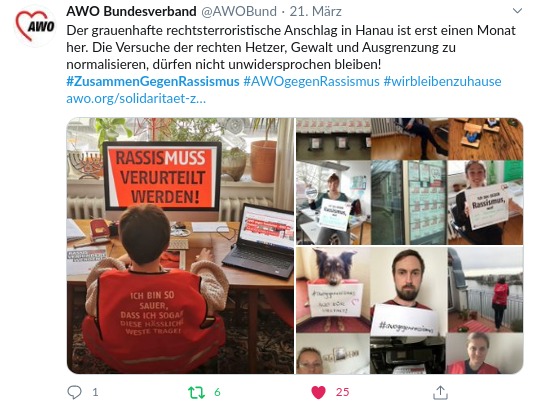 Die Covid-19 Pandemie und die zur Eindämmung beschlossenen Richtlinien in Berlin ließen während des Shutdowns keine Versammlungen und Kundgebungen zu. Eine Herausforderung, der die Berliner Zivilgesellschaft kreativ, sichtbar begegnete. Berlin gegen Nazis hat diese Aufgabe in einem Gastbeitrag bei taz bewegung beschrieben und dokumentiert hier die erste stadtweite Online-Aktion #ZUSAMMENGEGENRASSISMUS.