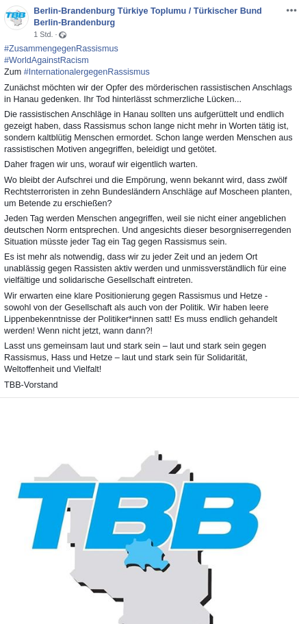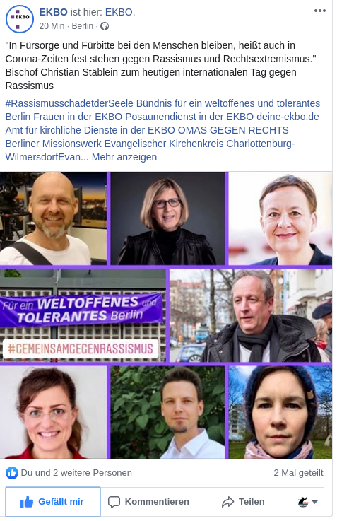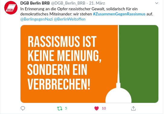 Auch das Bündnis für ein weltoffenes und tolerantes Berlin beteiligte sich am Aufruf zur Online Aktion. Neben den eigens erstellten Share-Pics beteiligten sich viele der Bündnismitgliedern mit eigenen Statements in Wort und Bild. Dabei waren u.a. die Gartenfreunde, der Landessportbund, der DGB, die AWO, die EKBO, der TBB, Gesicht Zeigen!, das House of One und das Erzbistum Berlin.
