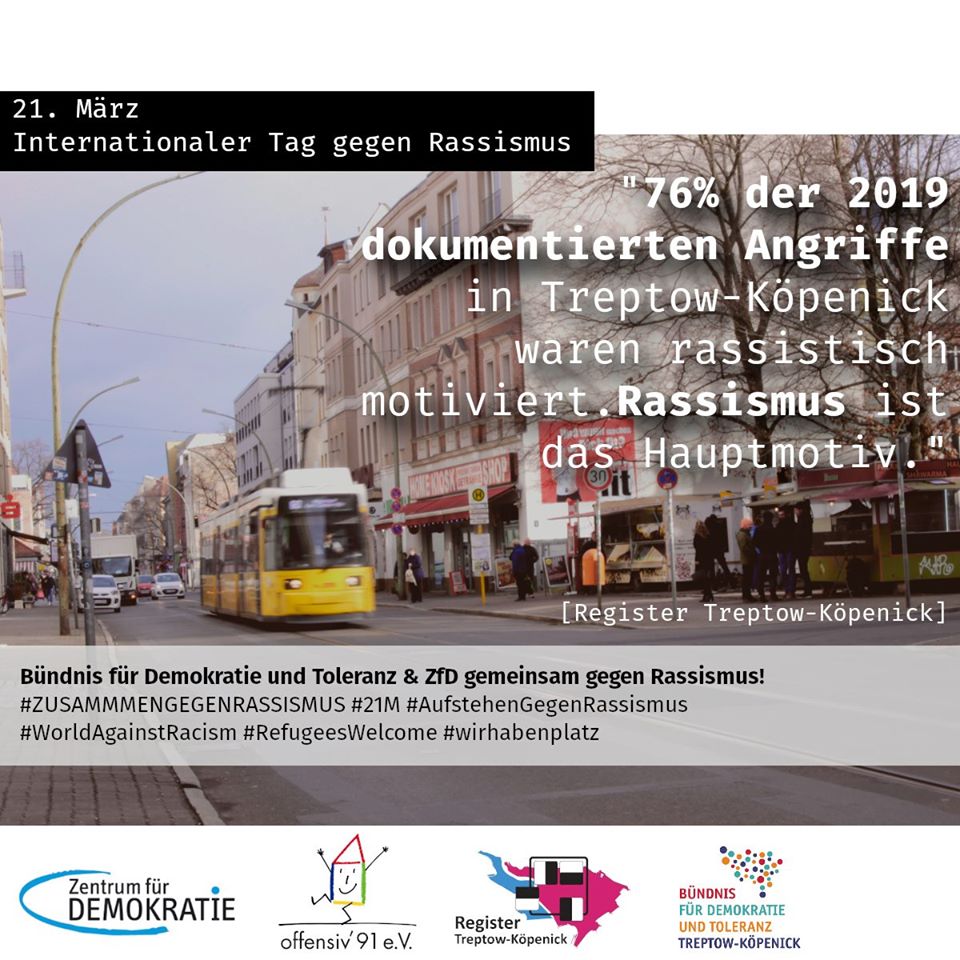 Seit vielen Jahren wird am 21. März in Rudow eine Kundgebung organisiert. In diesem Jahr riefen das Bündnis Neukölln sowie die Initiative „Rudow empört sich“ zu einer Demonstration auf, die ab 13.00 Uhr im Neuköllner Süden beginnen sollte. Vor dem Hintergrund der seit Jahren anhaltenden rechtsextremen Angriffsserie in Neukölln war der Ort wohl gewählt. Unterstützt wurde der Aufruf von nahezu allen Berliner Bündnissen und Initiativen, von Anwohner_inneninitiativen, bis hin zu Parteien. Aufgrund des pandemiebedingten Versammlungsverbots haben die Organisator_innen und ihre Unterstützer_innen den Protest ins Internet verlagert.