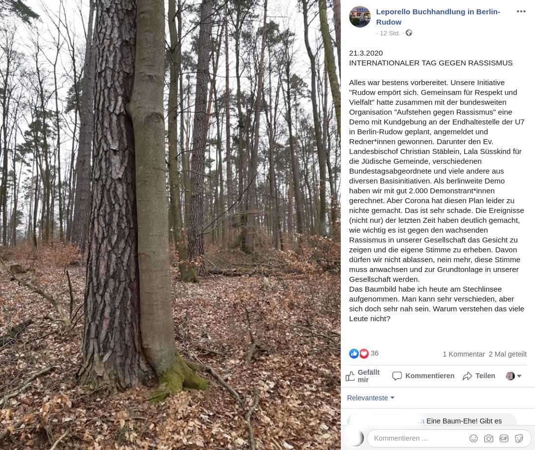 For many years, a protest event has been taking place in Rudow on March 21. This year, the alliance Bündnis Neukölln as well as the initiative „Rudow empört sich“ called to join their Demonstration scheduled to start at 13:00 in the south of the Neukölln district. The call was supported by almost all Berlin-based alliances and initiatives, residents’ and neighborhood initiatives, as well as by political parties. Due to the issued ban on gatherings, the organizers and supporters took theit protest from the streets to the internet.